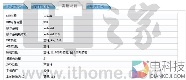 配置方面,其搭载1.4GHz四核处理器,辅以3GB内存+32GB可扩展存储,500万像素后置+200万像素前置摄像头。