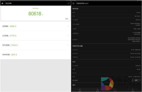 在跑分测试中,小米平板3在安兔兔中可以跑出8万分左右,和骁龙650基本相同,略低于骁龙653。