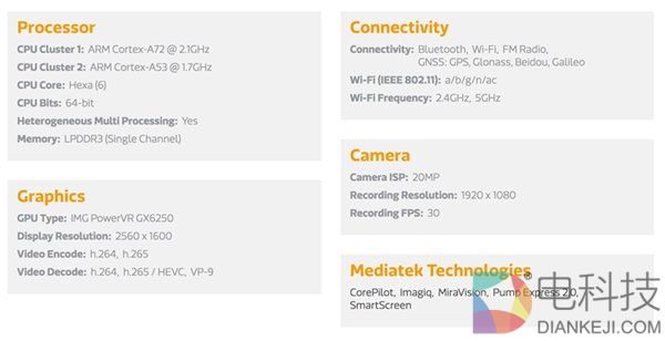 CPU方面,MT8176拥有2个Cortex A72核心(最高主频2.1 GHz)以及4个Cortex A53核心,GPU为ImaginationTechnologies的PowerVR GX6250(主频600 MHz),支持4K H.265视频的解码,台积电28nm HPM制程。