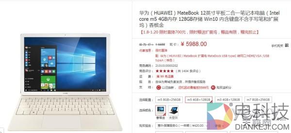 售价方面,HUAWEI MateBook国行版搭载Core M3处理器4GB内存+128GB固态硬盘为4988元(包括键盘保护壳);搭载Core M5处理器4GB内存+128GB固态硬盘为6688元(包括键盘保护壳),搭载Core M5处理器8GB内存+256GB固态硬盘为7388元(包括键盘保护壳);搭载Core M7处理器8GB内存+256GB固态硬盘为9688元(包括键盘保护壳、手写笔以及扩展坞)。