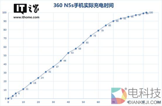 除了强劲的电池之外,360 N5还支持18W的快充。经过IT之家的测试,360 N5s手机0-100充电时间为92分钟,其中30分钟充电37%,60分钟充电79%,大概在90%的电量之后处于涓流充电的状态。总体而言360 N5s的充电时间要比360 N5快了不少,考虑到电池容量的缩水,充电时间加快也在情理之中。