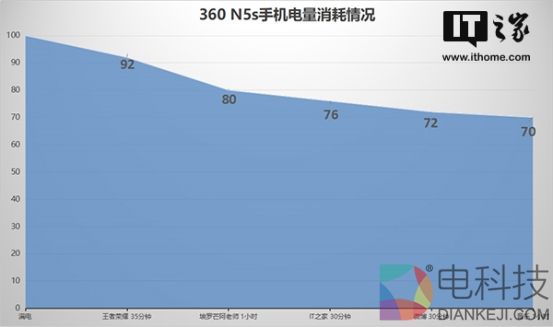 和以往一样,IT之家使用了我们自己的测试手段来对360 N5s进行测试,比如说35分钟的《王者荣耀》、1个小时的视频播放、30分钟的微博和30分钟的IT之家,然后还有一个小时的音乐,这样子基本上就是属于中度使用了。