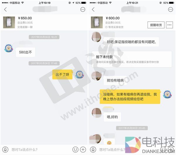 发布交易消息的时候,需要注意对手机的基本情况做尽可能详细的描述,包括手机的版本信息、成色、外观和功能有没有缺陷,以及自己的其他需求等。信息发布后,很快有几位买家询问iPhone5s的情况。虽然闲鱼上的价格标明了“一口价”,但实际上过来询问的几位买主大多都进行了压价,有压价到650元或者600元不等的,最低有压到550元,小编尝试和对方商议,不得不说,讲价格的过程还是挺耗费精力的。同时在和对方交流的过程中,还被需求提供手机详细的信息,拍摄更多的照片和视频等。
