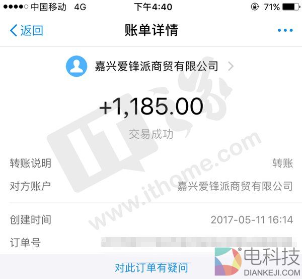 IT之家小编于5月8日上午11:00左右将手中的iPhone6 Plus通过顺丰快递寄出,5月10日下午约18:00收到爱锋派的短信通知,表示对设备的价值检测和爱锋派网站估值的价格一致,并要求填写详细个人信息,其中包括上传身份正反面的照片。小编如实提交个人信息后,于5月11日下午约16:00受到了爱锋派1185元的打款。整个过程大约耗时3天。对于邮寄回收来说,这个时间跨度还是可以接受的。