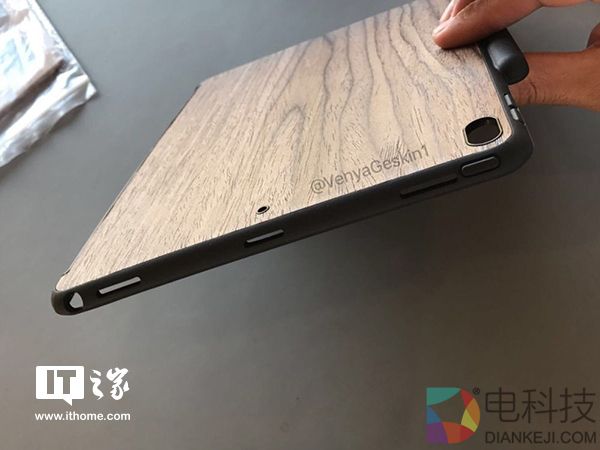 该保护壳侧边有一个Apple Pencil安放架,并且后面集成了一个支架,根据图片,这款10.5英寸的iPad Pro采用了四扬声器设计,拥有一个Lightning接口,摄像头的开孔也更大一些,暗示摄像头或有所升级。