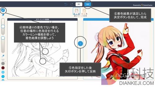 “pixiv Sketch”这次提供的AI自动上色服务,就是在今年1月时日本出现的测试用AI自动上色服务“Paints Chainer”,“Paints Chainer”服务的技术核心是深度学习框架Chainter还有Python接口的OpenCV(英特尔的视觉库),通过深度学习网络上的60万张已经上色的插图来学习人类上色方式,具体使用时需要操作者在已完成的线稿上标记好不同颜色的上色区域,之后通过GPU运算生成上色的图片。