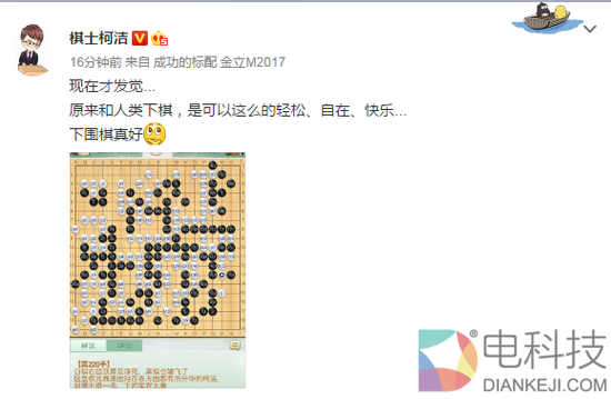 “现在才发觉......原来和人类下棋,是可以这么的轻松、自在、快乐......下围棋真好。”取得大胜的柯洁赛后在微博上写道,这也更像是他输给AI后情感上的宣泄。