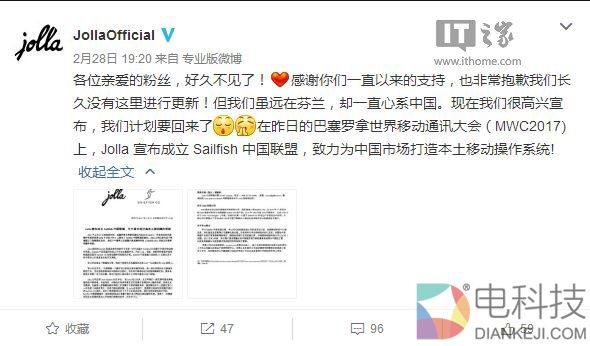 IT之家3月1日消息 在MWC2017世界移动通讯大会上,芬兰科技公司Jolla宣布回归中国市场,表示将成立Sailfish中国联盟,致力为中国市场打造本土移动操作系统。